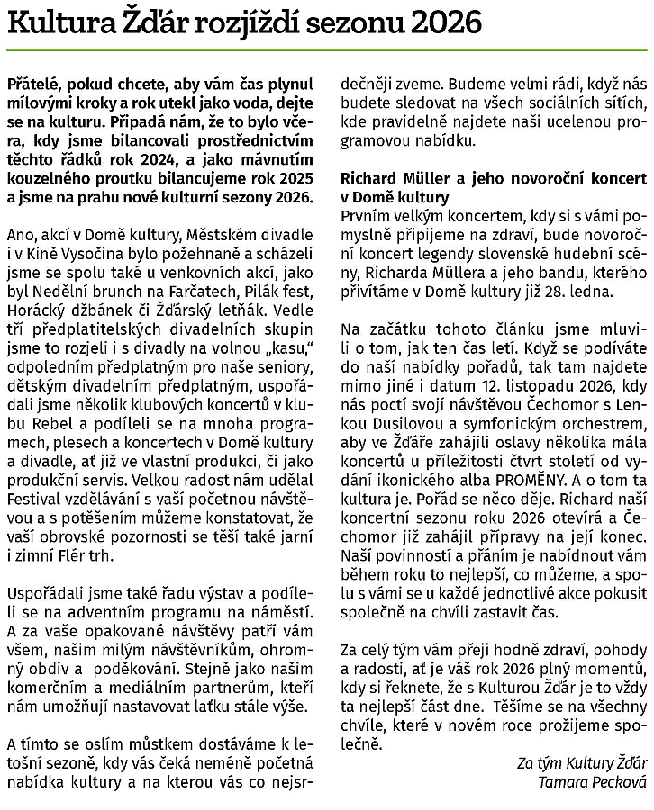 - 260122 ŽĎÁRSKÝ ZPRAVODAJ Kultura Žďár rozjíždí sezonu 2026