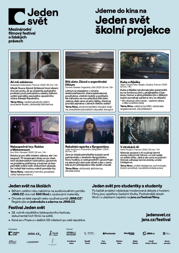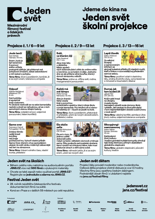 Jeden svět pro studenty a studentky je určen pro starší žáky základních škol, ale primárně pro studenty středních škol. Doporučujeme pro studenty 2. - 4. ročníku. Zahraniční filmy jsou opatřeny českými titulky. Po každé projekci následuje moderovaná debata s hostem*hostkoku/odborníkem*odbornicí na dané téma, či přímo s tvůrcem.