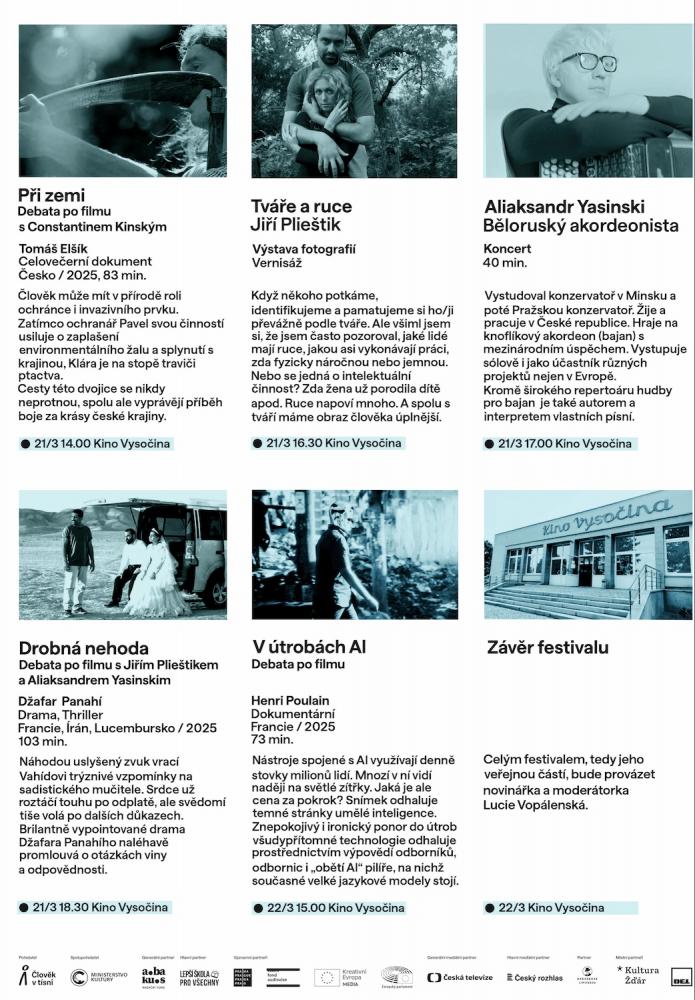 Slavnostní zahájení festivalu a první veřejná projekce proběhne 21. března 2026 ve 14. hodin v Kině Vysočina. Těšit se můžete na dokument Při zemi.